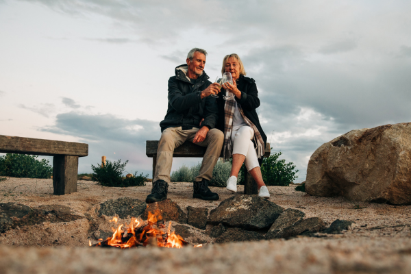 Low seating and soft blankets invite guests to relax into the moment, while the rhythm of the fire and the vast southern sky create a sense of calm, perspective and closure.